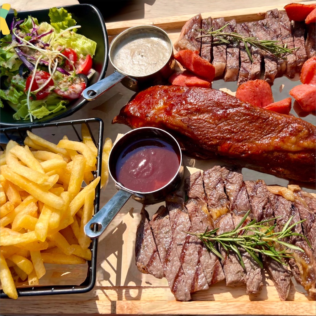Set Meat Platter II ngon tuyệt này bao gồm: 1 miếng Beefsteak thăn nội Tenderloin và 1 miếng Lõi Thăn Vai Topblade Mỹ, Sườn tảng nướng BBQ cỡ S, Xúc xích nướng, Khoai tây chiên, Ngô nướng, Salad ăn kèm Sốt BBQ và một loại sốt khác tự chọn