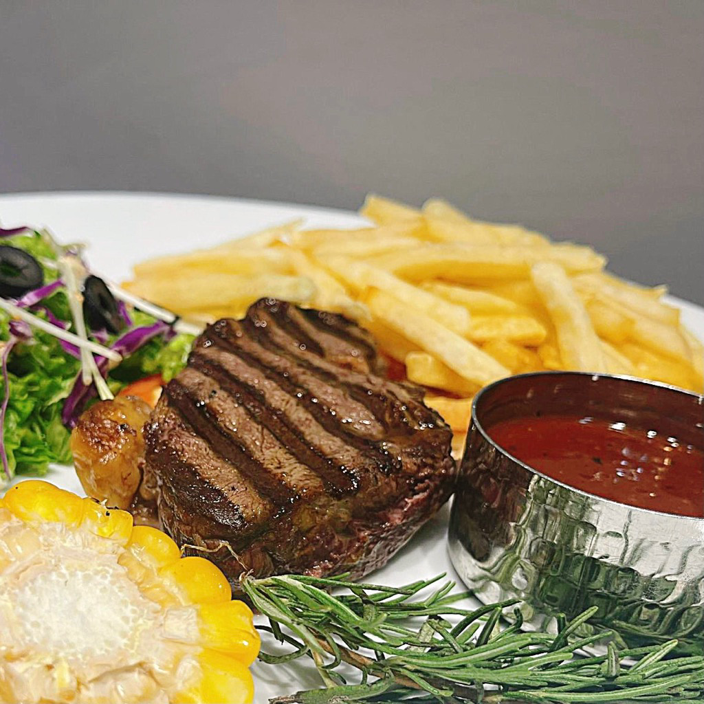 130-150 gram thăn nội Bò Úc nhập khẩu được served cùng khoai chiên/ khoai bổ cau/ khoai tây nghiền tuỳ lựa chọn, rau vườn tươi, và các lựa chọn sốt tươi home-made cực ngon!
